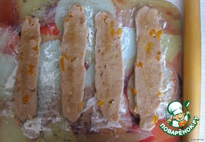 Вымесив тесто и сформировав шарик, отщипываем по кусочку и формируем «колбаски».