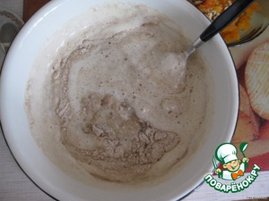 Вначале нужно приготовить опару: В просторную подогретую миску выливаем стакан теплой воды и высыпаем дрожжи. Когда они растворятся, вводим пшеничную муку и замешиваем опару.