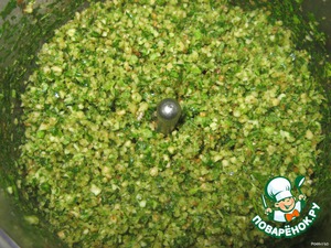 Пропустить через мясорубку или измельчить в блендаре орехи, зелень, лук, чеснок до однородности.