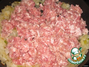 Добавить фарш (у меня свинина), перекрученный на крупную решетку мясорубки. Я готовлю фарш заранее, чтобы потом сэкономить время.