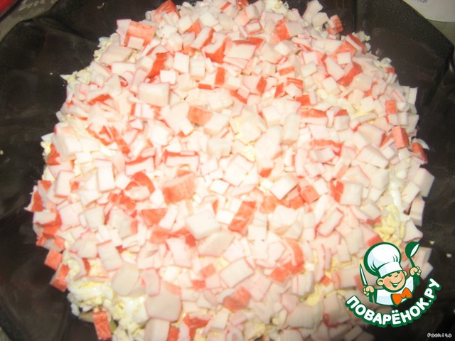 Выкладываем слоями, промазывая майонезом: