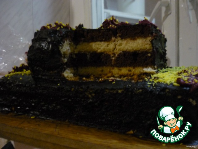 Смазать коржи сметанным кремом и сверху залить помадкой.
