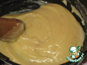 Для быстроты процесса переложить в другую посудину и поставить в тазик с холодной водой, периодически меняя воду на более холодную и перемешивая массу. Массу остудить до комнатной температуры, ниже не стоит, сгущенка твердеет и потом трудно будет смешивать с остальными ингредиентами.