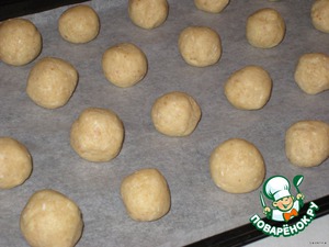 Достать тесто для печенья. Руками сформировать маленькие шарики, диаметром примерно 2 см, выложить на противень и выпекать около 12-15 минут, в зависимости от размеров, до золотистого цвета.