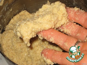 Затем добавить кокосовую стружку (0,5 стакана, это примерно 70 г), сухари, просеянную муку с разрыхлителем и крахмал, замесить тесто.