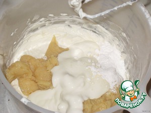 Смешать сыр, сгущенку, сметану и сахарную пудру.