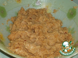 Смешиваем крошки с кремом (оставив 2-3 столовые ложки крема для дальнейшей смазки) и мешаем руками до максимально гомогенного состояния.