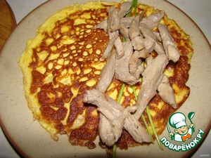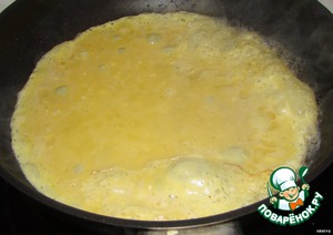 Немного масла... выливаем половину яичной смеси... пару минут обжариваем на одной стороне... и переворачиваем