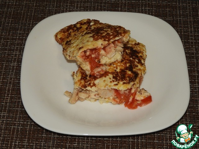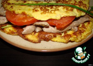 На половину нашего омлетого блина выкладываем мясо... помидоры... зелень и закрываем свободной половиной