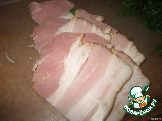 Режем ветчину на тонкие кусочки