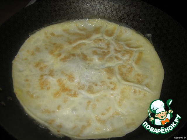 Дать яйцу растечься тонким слоем по сковородке и жарить до готовности с 2-х сторон -