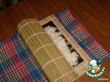 Аккуратненько, потихонечку сворачиваем циновкой ролл. Не рулетом - колбаской с начинкой строго внутри.