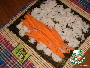 На циновочку блестящей сторой вниз кладется лист водоросли.