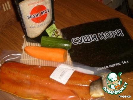 Понадобится пачка сушеных водорослей - нори (там пять пластин), пакет риса для суши - 250 грамм, морковь, огурец - чтобы было красиво, полоска горбуши дальневосточной холодного копчения. И обязательно - специальная циновка для скручивания роллов.