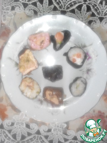 Все это укладывается красиво, подаются соусы, палочки, может быть - сакэ. Мои мужчины эту красоту оценили. Но только с точки зрения эстетического удовольствия. Васаби все нам испортил да и водоросли - не то, что нравится мужчине в России на ужин. Вкус очень необычный, в принципе, я представляю, что на это можно подсесть.