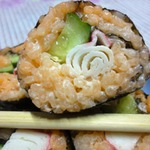 Рис отваривается и остужается по инструкции - промывается в холодной воде, замачивается на 20 минут, заливается затем водой в соотношении 1:2 и варится до кипения, потом еще на маленьком огне 10 минуток. Я сначала была против покупки специального риса, подумаешь, премудрость - вязкий клейкий рис сварить! Да у меня долгое время только такой клейстер и получался! Оказывается, не зря рекомендуют именно этот сорт. Склеивает все и вся, куда только не попадет. И руки едва отмыла, надо было смачивать их уксусом, разбавленнвм с водой, да опять-таки и желудки стало жалко - и так сплошной экстрим, и лень... Наверно, с уксусом управляться с таким рисом было бы легче.
