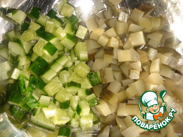 Огурцы (маринованные и свежий) нарезать кубиками.