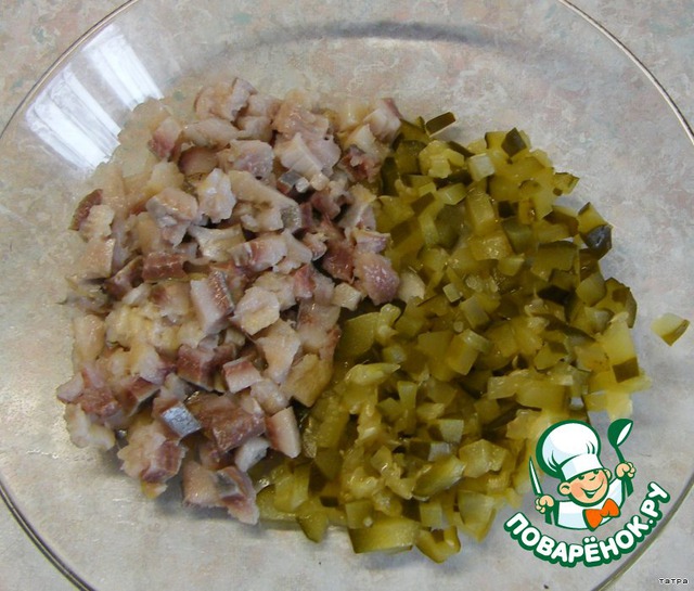 Все перемешиваем,добавляем майонез.Это будет наша заправка к салату.Хлеб режем кубиками и поджариваем на сковороде с небольшим добавлением растительного масла.