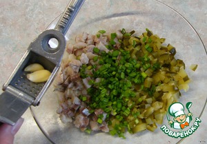 Добавляем резанный зеленый лук и измельченный чеснок.
