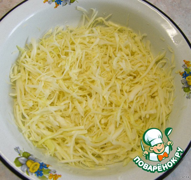 Капусту нашинковать соломкой,слегка перетереть с солью.
