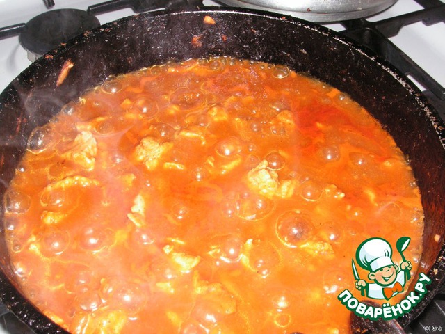 Добавляем соус, перемешиваем и заливаем все куриным бульоном так, чтобы курочки видно не было, и тушим до загустения соуса на медленном огне