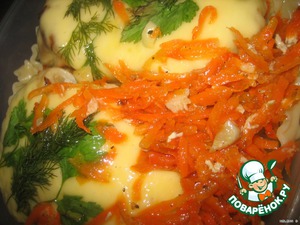 ... далее вынимаем блюдо и... переворачиваем куриные кусочки так, чтобы она легла на морковь, как на перину... и опять убираем на 10 минут в печь