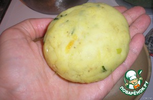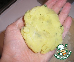 • Из картофельного пюре в ладошке делаем лепешку с углублением посередине.