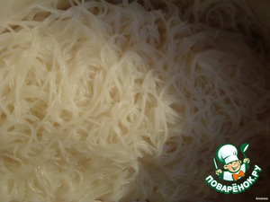 Отварить рисовую вермишель в подсоленной воде. Слить воду, хорошо промыть.