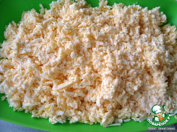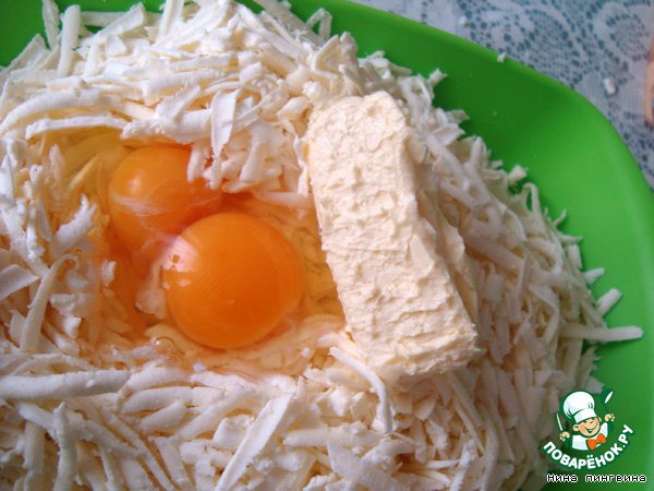 Натераем сыр , добовляем яйца и масло
