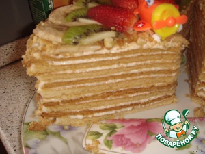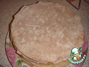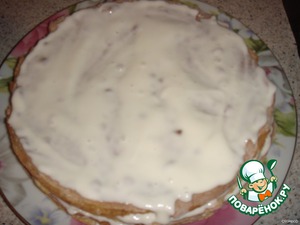 Смазываем кремом ( 1 л. сметаны и 1 стак. сахара, 1 пакет ванилина), крем нужно приготовить заранее, чтобы сахар растворился в сметане.