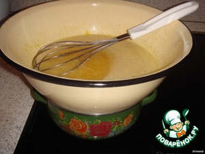 Добавляем 1 стак. сахара и 4 ст. л. жидкого мёда. Ставим на паровую баню и держим, помешивая, до образования сверху белой пены.