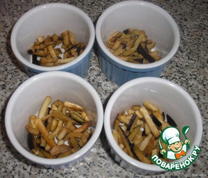 Баклажаны раскладываем по формам. Они у меня нарезаны соломкой. Я покупала заморозку. Можно использовать свежие.