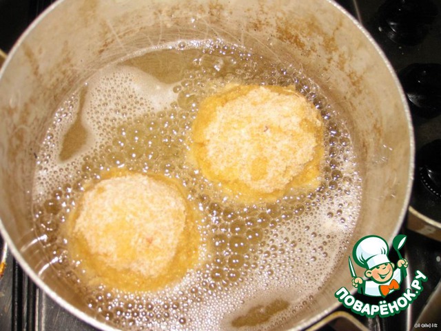 Края лепешки соединить, чтобы получился шарик, готовый положить в тарелку с яйцом. Слепить второй. Котлетку обмакнуть в яйцах, аккуратно переложить в тарелочку с сухарями, затем – снова в яйца и т. д. Процесс повторить 3 раза (яйца-сухари, яйца-сухари, яйца-сухари).