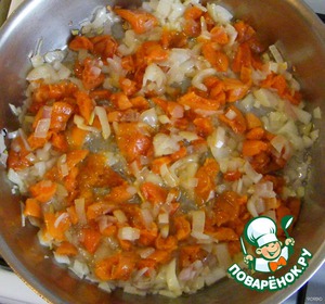 Курагу замочить в теплой воде, затем нарезать брусочками и обжарить в растительном масле вместе с мелко нарезанным луком, посолить, поперчить.