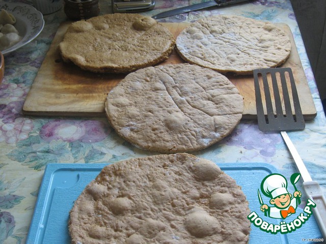 Всыпать 2 стакана муки и оставить в холодильнике на сутки. Это опять же из оригинального рецепта. Я пошла другим путем - мое тесто немного постояло и я еще досыпала муки,чтоб замесить более крутое тесто, мне захотелось тонких коржей, которые надо раскатывать