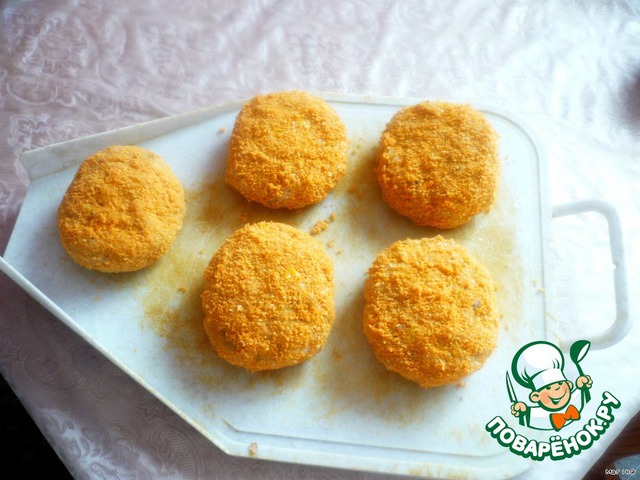 Разделить массу на 5 частей, обмакнуть во взбитое яйцо и обвалять в сухарях. Затем поместить наши будущие фишбургеры в холодильник на некоторое время.