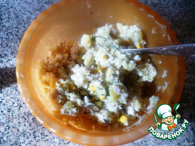 Переложить пюре в миску с рыбой, добавить кукурузу, влить растопленное масло. Посолить, поперчить, добавить приправы и перемешать.