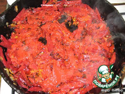 Когда зажарка готова, добавляем в нее же резанную полосками свеклу. Оставляем тушиться на маленьком огне.