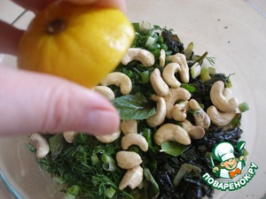 Перекладываем шпинат в глубокую мисочку, добавляем к нему мелко рубленный укроп, зеленый лук, листочки мяты и 2/3 орехов кешью. -