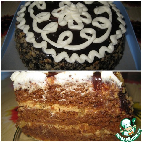 Ну, а теперь прослаиваем коржи кремом, а сверху посыпаем измельченными грецкими орешками.