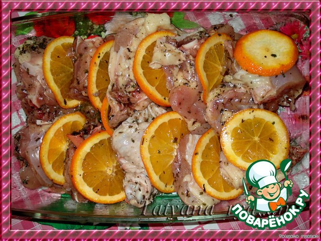 Курицу выложить в форму для запекания с высокими краями, между кусками прокладывать кружочки апельсина. Сверху курицу полить оставшимся в чашке маринадом.