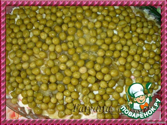 Украсить салат по собственному желанию. Я украшала консервированным горошком и кружочками маслин.