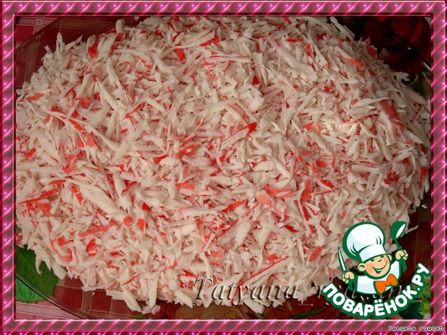 Крабовые палочки натереть на крупной терке, выложить третьим слоем. Смазать майонезом.