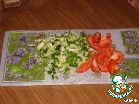 • Режем помидорчик, огурчик по вкусу - крупно, мелко.