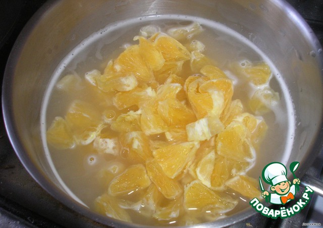 Апельсин почистить, разобрать на дольки. Нарезать кусочками.