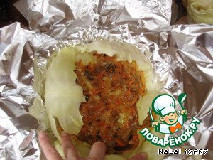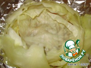 Когда капуста будет нафарширована, то края фольги соединить, закрепить и, слегка придавливая, придать форму капусты.