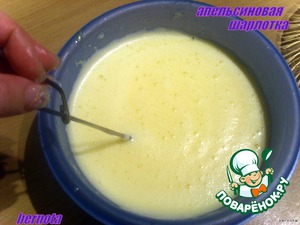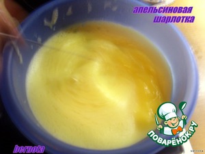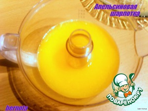 В чашку выливаем сок апельсина, добавляем 100 грамм сахара и 5 желтков и взбиваем до образования пены. -