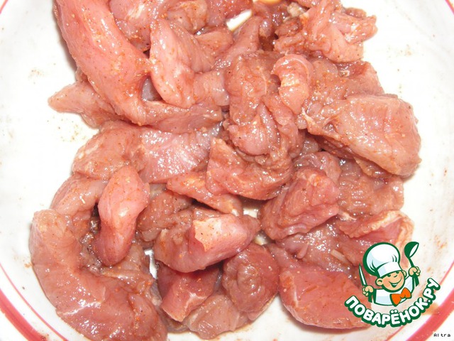 Мясо режем на мелкие кусочки, посыпаем специями, добавляем соевый соус и давленый чеснок