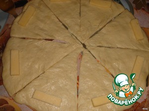 На каждый сегмент положить по кусочку рыбы и скатать рогалики. -