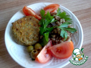 Я подала на стол с гречневой кашей, сваренной на воде, зеленью, оливками и свежей помидоркой.